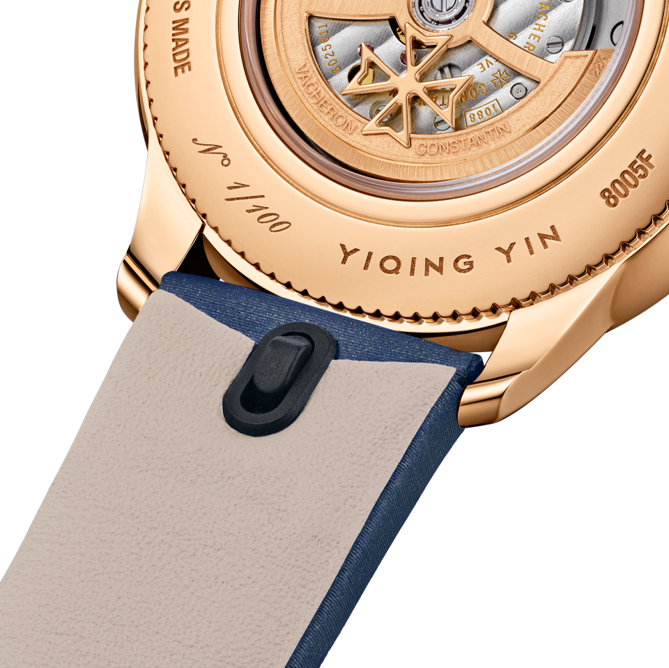 Proud to collaborate with designer Yiqing Yin, Vacheron Constantin presents this 18K 5N pink gold watch. This limited piece reveals a Lilac mother-of-pearl dial with a pleated motif, similar to an Haute Couture fabric. Around clouds of mother-of-pearl, no less than 36 round-cut diamonds surround the moon and its starry sky. This watch is illuminated by a bezel adorned with 58 brilliant-cut diamonds, while the crown is set with a moonstone. For a variety of delightful looks, the watch is accompanied by three easily interchangeable straps : alligator, grained calfskin and satin effect calfskin.
