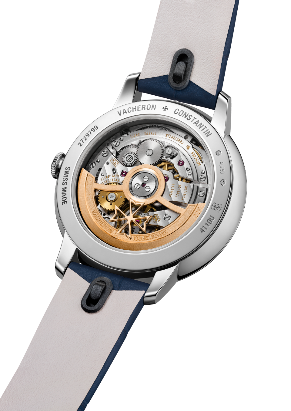 Faithful to its understated, timeless elegance inherited from the 1950s, this self-winding watch has a refined feminine identity, featuring a redesigned curvature with a slightly domed gradient tone dial. With a diameter of 36.5 mm, it comes in 18K white gold with a deep blue dial, gold bezel, and minute-counter set with 48 diamonds. The seeming simplicity of the self-winding Patrimony is the result of meticulous attention to detail, as further evidenced by the finishes on its 2450 Q6/3 caliber, displaying the hours, minutes, seconds and date. It features an interchangeable strap that can be released by pressing lightly on a single-push button, with no need for a tool.